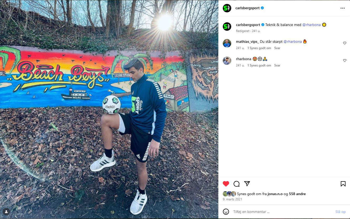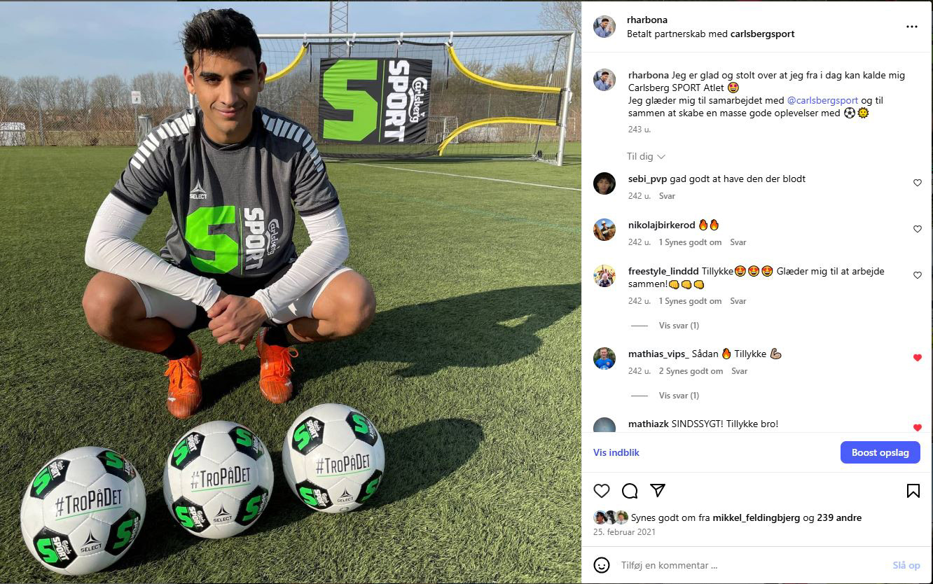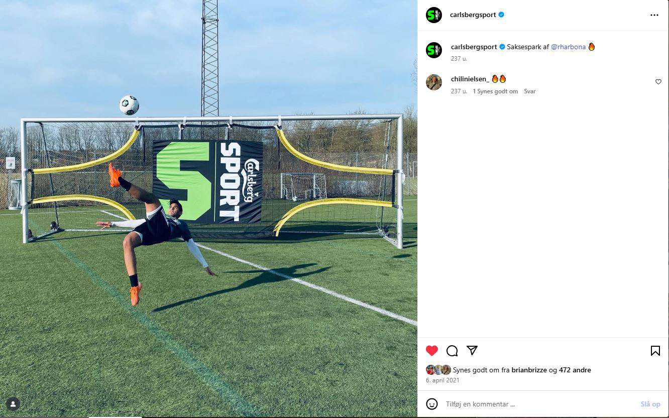 Mit samarbejde med Carlsberg SPORT (2017–2021) bød på en række events hos forskellige fodboldklubber, som jeg både udførte, dokumenterede og redigerede indhold fra til egne og deres sociale medier. Carlsberg SPORT var mine første klienter, og jeg lærte meget af at være en del af deres projekter – både i udførelsen og den visuelle formidling. Det blev også mit længste samarbejde med en organisation. Nedenfor har jeg udvalgt et par videoer og opslag, der opfyldte deres ønsker.